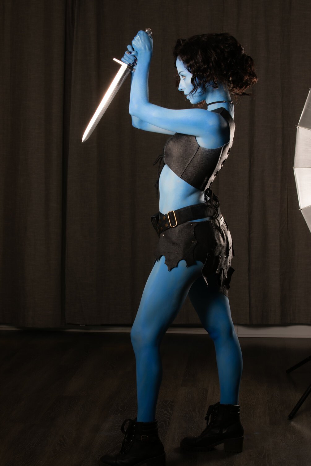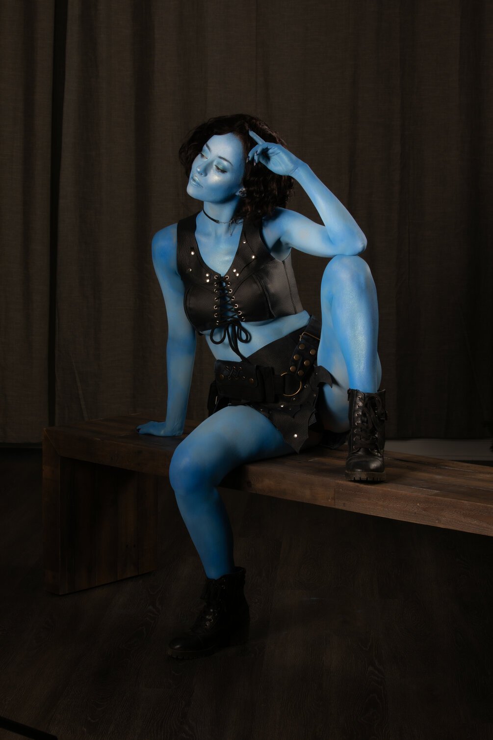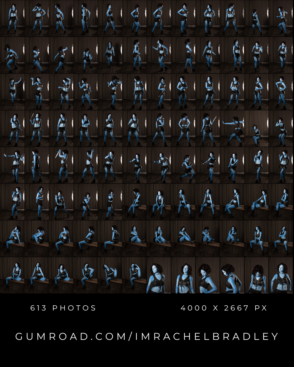 This leather ensemble will be the perfect reference for your lightly-armoured, stleathy, fighter OCs. I went for a mix of tough and playful in this pack- I think the costume suited both vibes. And the blue skin will give you something a little extra to play with!